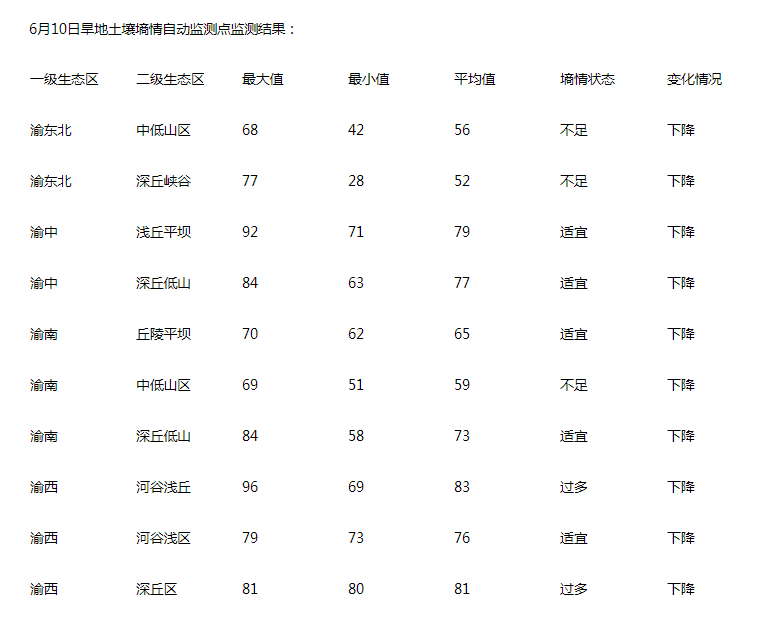 9日,重庆西部地区分散阵雨转阴天,其余地区阴天有阵雨,局地中雨。10日,重庆东部地区仍有阵雨,其余地区阴天间多云。气温18~33℃,相对湿度50%~100%。从各地土壤墒情自动监测点的监测结果表明,旱地土壤墒情大部适宜,部分过多,局地不足或干旱。