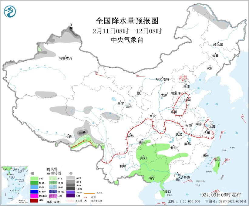 图2 全国降水量预报图(2月9日08时-10日08时)
