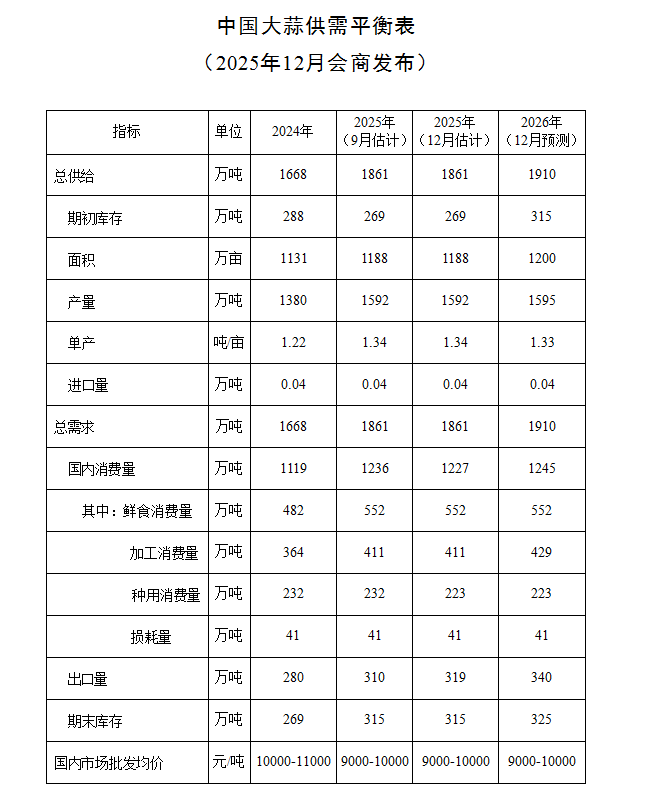 目前,我国大蒜2025年秋季播种已经结束,本月对2025年供需数据不做调整。总体看,虽然今年大蒜价格有所下跌,但由于比较效益较好,蒜农种植积极性较高。本月预测,2026年,大蒜面积增至1200万亩,比上年增1.0%;今秋黄淮海地区降雨偏多,主产区部分地块偶有积水,不利于大蒜播种及生长,预计单产小幅下降,亩产为1.33吨,比上年减0.7%;产量为1595万吨,与上年基本持平,大规格高品质蒜产量可能小幅下降。国内消费量1245万吨,比上年增1.5%,其中,加工消费量429万吨,较上年增4.4%。大蒜出口量340万吨,较上年增6.6%。期末库存总体充足,为325万吨,较上年增3.2%。晚播大蒜越冬受冻风险较高,后期需密切关注并做好防冻准备。